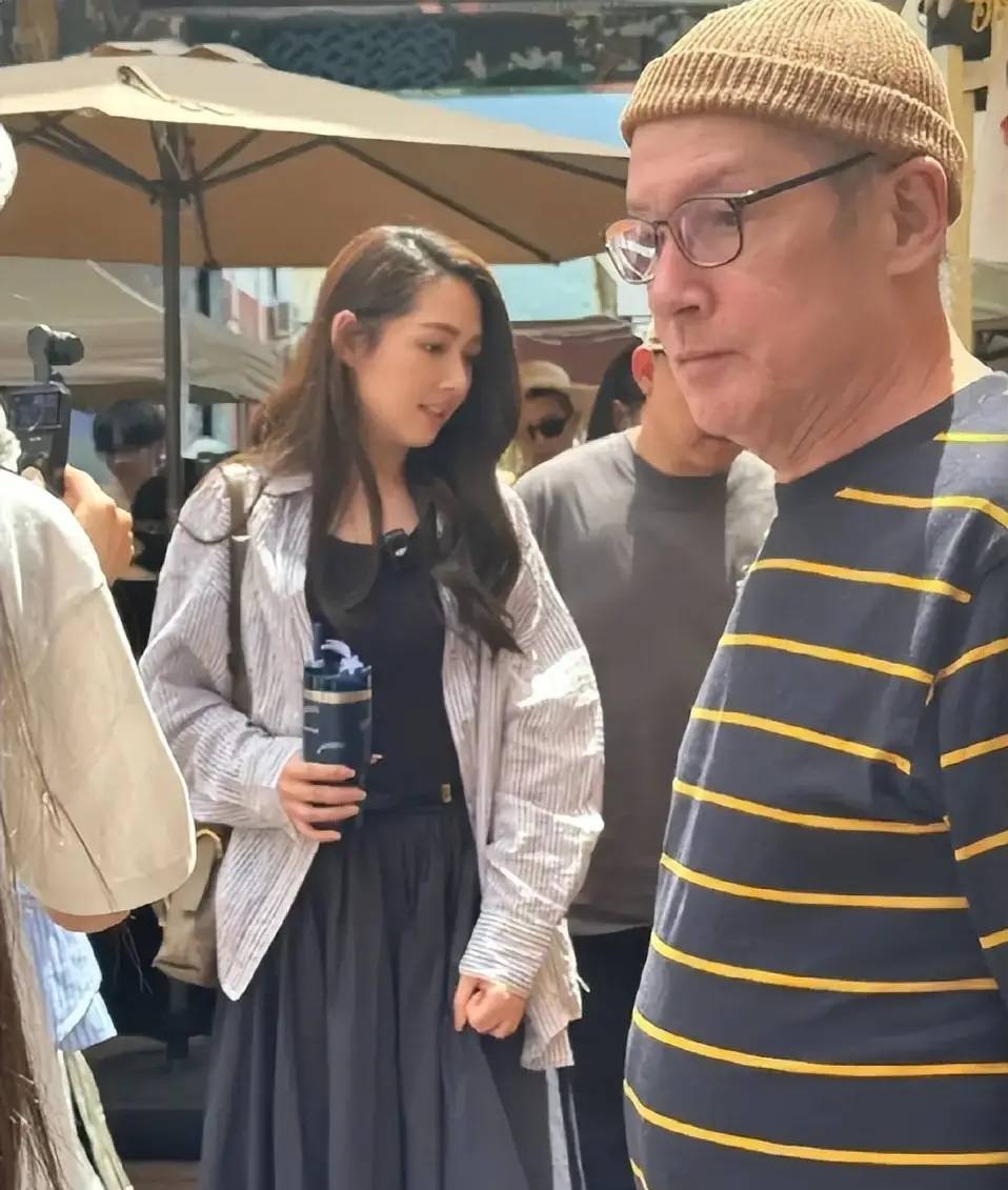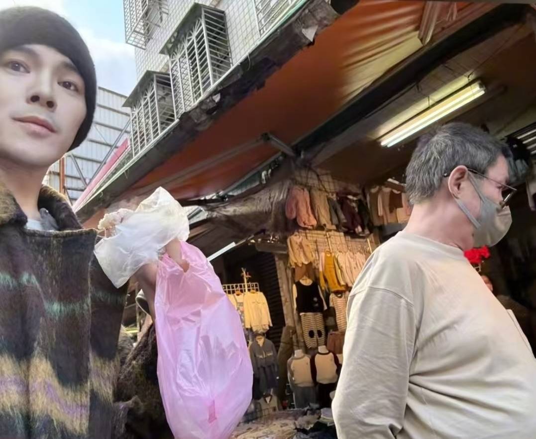 视频里向佐陪着岳父出门遛弯,岳父挺着大肚子看着路边商贩卖的东西,向佐则拿着买的包子和其他东西开心的跟在岳父身边。